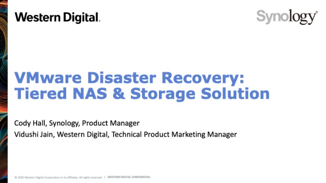 Any downtime in your business (or homelab) can spell disaster. In this webcast we will take a deep dive into different Synology and WDC solutions for backing up and storing your virtual machine data. You will learn how to integrate VMware with Synology’s high availability cluster, set up Synology license-free backup software, select right storage from Western Digital’s NAS optimized portfolio, and implement a complete recovery strategy. Please join our webinar on VMware Disaster Recovery: Tiered NAS and Storage Solution.