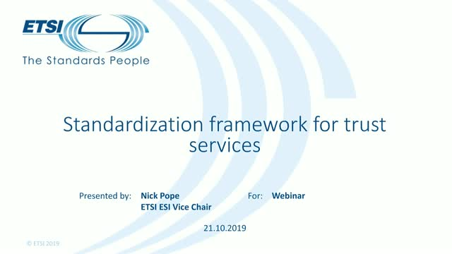 This webinar will provide an update of the latest activities of the ETSI Technical Committee Electronic Signatures and Infrastructures to provide a standardization framework for trust services.