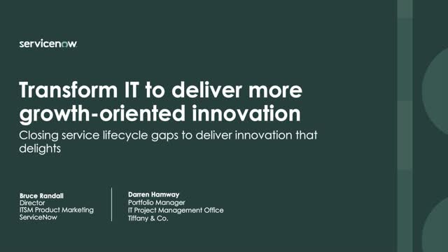 Digital transformation means transforming IT. Whether increasing productivity, driving insights, delivering innovation, or simply providing a consumer-like experience for employees, IT has proven to be an indispensable element in your business success. Join Darren Hamway, Portfolio Manager/IT Project Management Office, Tiffany & Co., and Bruce Randall, Director Product Marketing, ServiceNow to learn how to deliver innovation without negative employee impact, or breaking the bank on infrastructure and resources. In this webinar you’ll learn: How Tiffany & Co. has successfully merged their processes and procedures with ServiceNow to increase portfolio visibility and data output How ITSM and ITBM can be used together to automate gaps in the service lifecycle How combining ITSM and ITBM helps to deliver new innovations How to transition from successful IT service management to successful IT business management