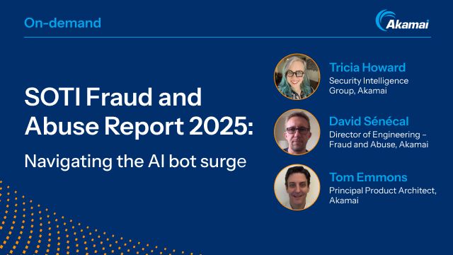 Our latest research reveals how AI-driven bots are reshaping the digital landscape — from content scraping that undermines publishers to commerce surges exceeding 25 billion bot requests in just two months. Watch this on-demand webinar to explore which regions and industries are seeing the sharpest rise in AI bot traffic, and learn how understanding bot identity and intent can help you distinguish between helpful and harmful automation. In this session, you’ll learn: • Why bot identity and intent are critical • Where AI training bots introduce new challenges • How OWASP guidance can strengthen fraud defenses while preserving good bot traffic Speakers: Moderator: Tricia Howard, Security Intelligence Group, Akamai Presenters: • David Sénécal, Director of Engineering – Fraud and Abuse, Akamai • Tom Emmons, Principal Product Architect, Akamai Akamai is an approved ISC2 CPE Submitter Partner. Earn CPE Credits by watching this webinar and providing your ISC2 Member ID number in the “Question” or “Rate this” section. Watch the webinar on demand now and gain insights to help protect your business from the next wave of AI-driven threats.