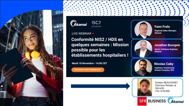 Vous êtes un établissement de santé et vous devez anticiper la mise en conformité NIS2 dès 2025 ? Vous cherchez une solution efficace, rapide et optimisée pour votre budget ? Akamai et SFR vous invitent à un webinaire dédié à la Segmentation Logicielle, une technologie référencée au marché CAIH, qui vous permet de : - Visualiser en temps réel vos flux grâce à une cartographie dynamique, - Définir et appliquer rapidement des règles de segmentation et micro-segmentation, - Mettre en œuvre les fondations de conformité NIS2 et HDS… en quelques semaines ! Témoignage exclusif du CHU 38 - Découvrez le retour d’expérience concret d’un établissement hospitalier qui a déployé la solution Akamai Guardicore : - Cas d’usages déployés - Gains en agilité - Renforcement rapide de la posture de sécurité Akamai est un partenaire agréé d’ISC2 pour la soumission des CPE. Gagnez des crédits CPE en regardant notre webinaire et en nous indiquant votre numéro de membre ISC2 soit dans la section « Question », soit dans la section « Évaluez ceci ».