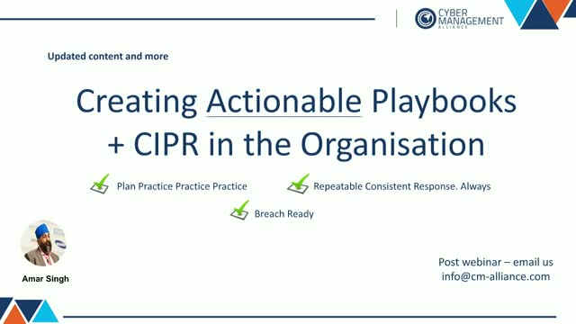 Wow - This is an exciting and busy webinar - with loads of templates and downloads too! * Live session on how we create an incident playbook from scratch! * Review of our playbook scratchpad - how we design the initial playbooks. * Automating incident response - some thoughts. * Exciting updates on the GCHQ-certified CIPR training This playbook webinar is taken from our certified Cyber Incident Planning & Response (CIPR) workshop and we will have several past attendees sharing their experience about the workshop and how they implemented the lessons from this training.