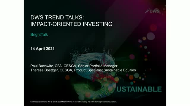 DWS invites you to join our "DWS Trend Talks about "Impact-oriented Investing" with Paul Buchwitz, DWS Portfolio Manager for Sustainable Equities and Theresa Boettger, DWS Product Specialist Sustainable Equities.