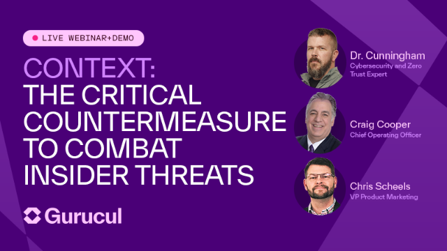 LIVE WEBINAR + DEMO Threats from within are the most difficult to identify without the right telemetry and analytics. Small and specialized Insider Threat teams are wasting limited resources chasing false positives, piecemealing strong cases of evidence and manually deriving context from siloed data. In this webinar, Gurucul’s Field CISO Craig Cooper is joined by industry expert Dr. Chase Cunningham to discuss how insider threat teams require and can achieve the right level of context to proactively predict, detect and mitigate insider threats. Join them as they unpack: 1. The current challenges facing insider threat teams. 2. How 360-degree context and machine learning analytics streamline insider threat programs. 3. How the Gurucul platform provides critical context via a live demo
