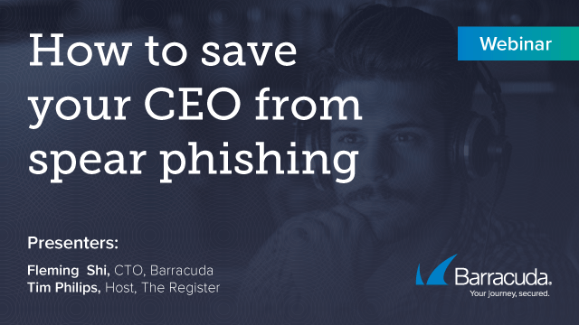 We’re all worried about phishing, but targeted attacks using spear-phishing may be an even bigger problem and one that’s much harder to defend against. Your gateways and good advice aren’t going to solve this security headache, so how do you save your CEO from becoming a victim? Join Fleming Shi of Barracuda Networks and the Reg’s Tim Phillips who will be discussing: - What a spear-phishing attack looks like - Why it will be impossible for traditional security tools to detect - What you can do about it