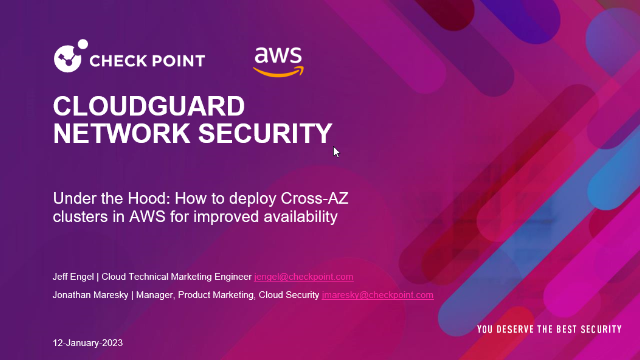 In this video we will walk you through the setup and configuration of a Cross-AZ cluster in AWS. This new clustering capability provided by the Check Point CloudGuard team allows organizations to build highly resilient architectures per AWS best practices.