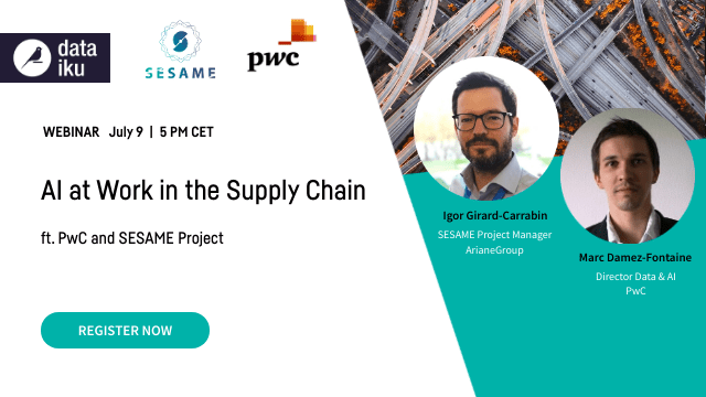 What are the actual challenges in supply chain management? How can AI improve business performance? And what are the pitfalls and best practices to analyze the data of your supply chain? Listen to Marc Damez-Fontaine, Director Data & AI at PwC, present different levels of AI technologies that can help supply chain operations. Right after we will hear from Igor Girard-Carrabin, Supply Chain Engineer at ArianeGroup, who will provide feedback on concrete use cases of AI for supply chain management within the European Commission funded SESAME project. The SESAME project aims at improving European launchers' manufacturing and operations through digital technologies, processes and methods. Speakers: - Marc Damez-Fontaine (Director Data & AI at PwC) - Igor Girard-Carrabin (SESAME Project Manager at ArianeGroup) Please be aware that by registering for this webinar, you agree to have your personal information shared with Dataiku's partner PwC.