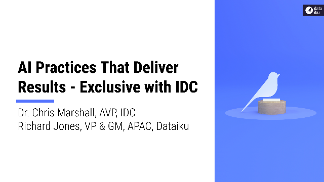 Exclusive with IDC Since the release of the 2020 IDC InfoBrief and with the release of the 2021 edition, we have seen nearly twice as many companies starting their AI journey. Plus, those that had already started are showing more AI maturity, experimenting less and executing more repeatedly and in a more coordinated way. Despite rising demand, AI projects remain difficult to execute. In this webinar, we will investigate the latest trends as well as the different strategies enterprises adopt toward AI, when they work and when they don't. During this exchange, Dr. Chris Marshall, VP Big Data, Analytics & AI at IDC, will review regional patterns in deploying AI while Richard Jones, General manager APAC at Dataiku, will discuss the challenges facing organizations when deploying their AI solutions. Bring your questions because we will be LIVE and make sure you are registered.