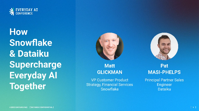In this session from Everyday AI New York, hear from Pat Masi Phelps, Principal Partner Sales Engineer at Dataiku, and Matt Glickman, VP Customer Product Strategy, Financial Services at Snowflake. Generative AI is not possible without a data strategy. Discover how Dataiku and Snowflake have created a secure, performant, and scalable environment to help customers leverage Generative AI—then watch a demo of using LLMs orchestrated by Dataiku on your governed data in Snowflake.