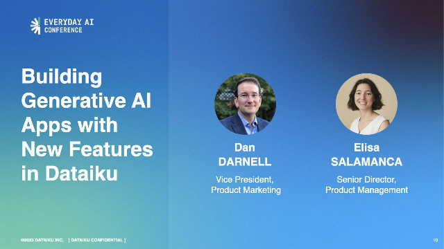 In this session from Everyday AI New York Tech Day 2023, hear from Dan Darnell, our VP of Product Marketing, and Elise Salamanca, our Senior Director of Product Management, on how to build Generative AI Apps with New Features in Dataiku.