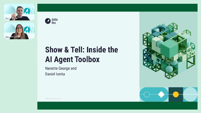 In this webinar, we'll walk you through a live demo showcasing how an AI agent can use tools like dataset lookup, web search, and email notifications to take action and deliver results — fast. Whether you're looking to automate tasks, streamline processes, or create custom solutions, this session is your ticket to mastering AI agent workflows in Dataiku.