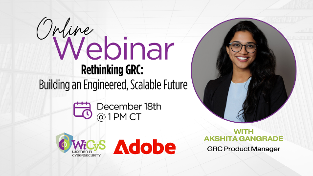 In this WiCyS webinar, Akshita explores how automation, scalable architectures, and product thinking are reshaping Governance, Risk and Compliance. Attendees will leave with a clearer picture of where GRC is headed, why engineering is at the center of the next wave of innovation, and how professionals at any stage can contribute to building systems that are not only compliant, but resilient, efficient, and future-ready.