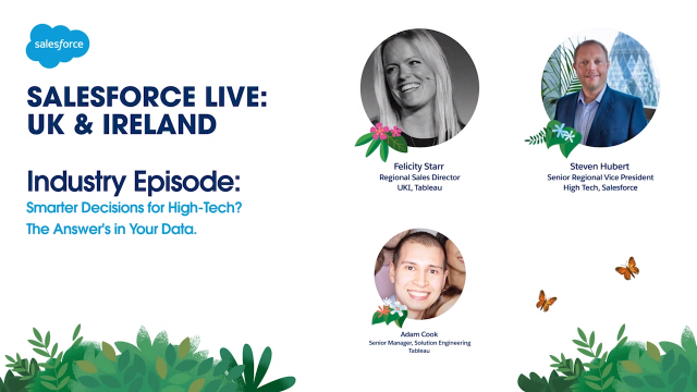 COVID-19 is impacting every part of business, from where we work to the way we measure success. Now more than ever, data is the key to smarter and more effective decision-making to move forwards and provide your business with new opportunity. High tech products are more connected than any other industries. Your customers expect to access data-based insights in every app and product they use to make smarter decisions. With the power of Tableau you will bring new ways for your customers to use, understand, and gain even more value from your product offerings. Join Steven Hubert Senior Regional Vice President, High Tech, Salesforce, in this session as the Tableau team share how you can: ● Deliver interactive visual analytics that empower your customers and drive product adoption. ● The value data brings to the entire sales organisation