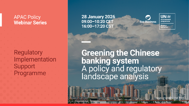 This webinar presents a new UNEP FI policy brief titled “Greening the Chinese Banking System: A Policy and Regulatory Landscape Analysis”.