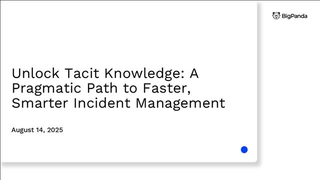 Join us for a demonstration of how the BigPanda AI Incident Assistant unlocks learned and tacit knowledge to drive smarter decisions and more efficient operations. We’ll explore how to harness existing ITSM data and messy or incomplete data to address your most pressing incident management use cases, from major incidents and network outages to SME escalations and bridge calls. Hear from our AI product experts as they walk through a progressive data strategy, including a realistic timeline to get started and a clear path to demonstrate measurable impact. You’ll walk away with a clear understanding of how BigPanda can fill knowledge gaps, inform continuous learning loops, and accelerate incident response.