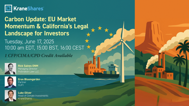 Join KraneShares Head of Climate Luke Oliver, Climate Finance Partners’ Eron Bloomgarden, and Rick Saines ONM, Managing Director at Pollination Law LLC and leading carbon lawyer, for an update on global carbon markets with a focus on California’s legal landscape.