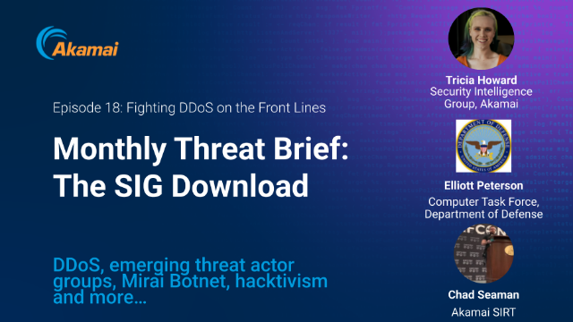 In this special half-hour episode of The SIG Download, host Tricia Howard is joined by Elliott Peterson (U.S. Department of Defense) and Chad Seaman (Akamai SIRT) for an inside look at the evolving DDoS threat landscape.