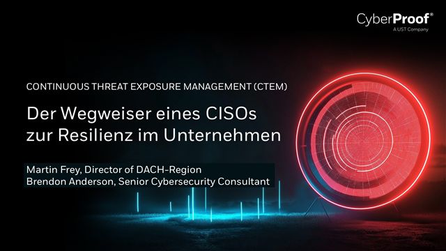CISOs in Unternehmen stehen heute unter zunehmenden Druck die wirklich wichtigen Bedrohungen zu priorisieren. In diesem Webinar stellen wir die Continuous Threat Exposure Management (CTEM)-Lösung von CyberProof vor, die Sicherheitsverantwortlichen ermöglicht einen klaren, kontinuierlichen Überblick über das Gefährdungspotential und die Verteidigungsfähigkeit ihres Unternehmens vor Cyberattacken zu erkennen und mit Hilfe der Ergebnisanalyse entsprechend anzupassen.