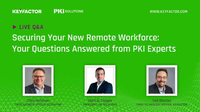 The Coronavirus (Covid-19) has changed the way we work, seemingly overnight. The pandemic has not only forced IT and security professionals to work remotely, but also deploy remote access for their now at-home employees, without compromising security. In this new reality, without appropriate measures in place to scale remote-working capabilities, businesses face an unparalleled challenge to secure critical systems and digital identities. Join us for a LIVE Q&A with Keyfactor’s CSO Chris Hickman, CTO Ted Shorter, and PKI Solutions' Mark Cooper (aka "The PKI Guy") as we take your questions and give practical advice for managing your PKI during this uncertain, and highly remote environment.