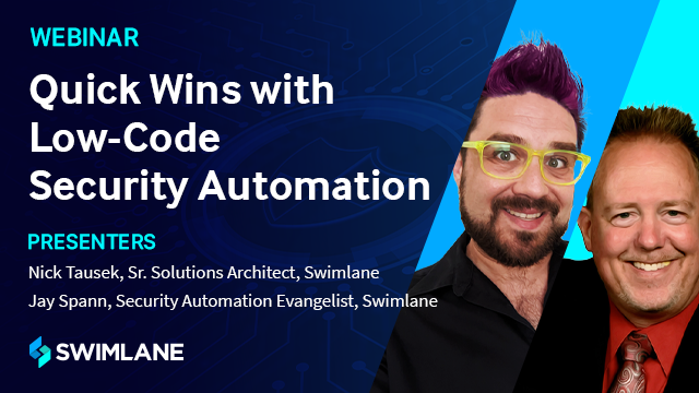 The world’s most successful organizations are increasingly supercharging their security operations with automation. From phishing alert triage and insider threat investigation to case management, there are an unbelievable number of uses for replacing manual activities with low-code security automation. Whether you’ve already implemented automation - or are just beginning to explore its potential - it’s important to exercise a carefully planned approach to help you achieve the most with this technology. During this webinar you will learn: - How to gain insight into the performance of your SecOps investments - Where to focus energy to quickly maximize your ROI with automation - How you can use security automation to solve a host of complex challenges - Where security automation can be used in and beyond the SOC Join Swimlane experts to learn how you and your team can establish quick wins with low-code security automation.