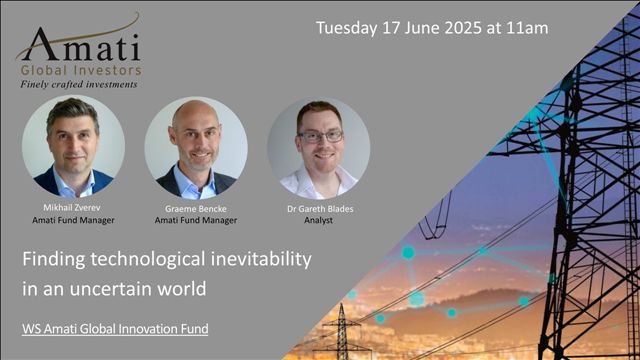 Join the Amati Global Innovation team for a Brighttalk session as the fund celebrates its 3 year anniversary. The team will explain the principles of their investment approach which has enabled them to discover innovation opportunities beyond the ubiquitous mega-cap tech stocks. The brief presentation will include insights into the highest conviction innovation themes in the portfolio, which the team believes are significantly under-appreciated by the market consensus, as well as discussing the current volatile geopolitical and trade environment and the opportunities this presents for long-term investors.