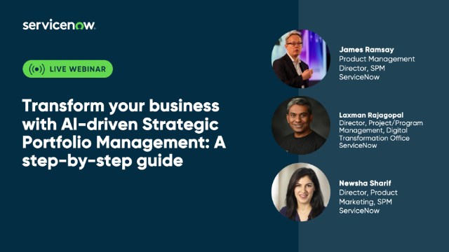 James Ramsay, Product Management Director, SPM, ServiceNow; Laxman Rajagopal, Director, Project/Program Management, Digital Transformation Office, ServiceNow; Newsha Sharif, Director, Product Marketing, SPM, ServiceNow