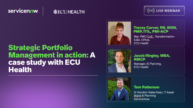 Tracey Carver, Manager, PMO CoE, ECU Health; Jacob Ringley, Manager, IS Planning, ECU Health; Tom Patterson, Sr. Solutions Sales Executive, ServiceNow