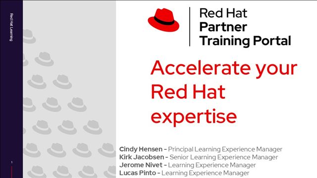 Ready to accelerate your Red Hat expertise and drive success? Join our webinar to explore the Red Hat Training Portal - your central hub for credentials, sales plays, technical content, and the latest updates to help you win in the market! During this showcase, we will explore the key focus areas including credentials, certifications, channels, technical content, and Power Hours.