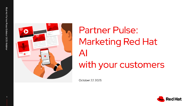 Join us as we kick off our new marketing webinar series, Red Hat Partner Pulse. In our inaugural webinar, we’ll share resources to help you go to market with Red Hat, spotlight the latest on Red Hat AI and show you how to drive demand with ready-to-launch campaigns in the newly available Red Hat Partner Demand Center, so you can start generating demand and leads right away. We’ll also cover recent partner announcements, and provide some exciting news about our newly launched Red Hat Ecosystem Innovation Awards program. Please join us to learn how you can best stay connected on the latest and greatest.