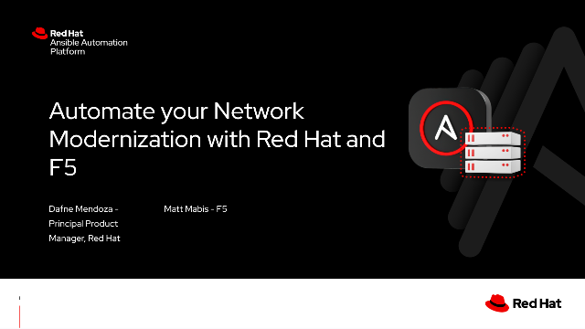 Join us as we look at how to automate and orchestrate your F5 ADSP modernization with Red Hat Ansible and F5. In today’s open hybrid cloud environment, network and security operations teams need a unified and consistent approach to ensure network operations including migrations and hardware updates are delivered quickly and securely - all while maintaining a centralized audit trail. The complexity of modern network infrastructure and the criticality of services running on F5 devices require a strategic automation solution.