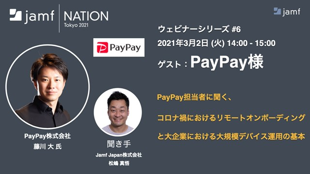 #エンタープライズ #大規模デバイス運用 #リモートワーク #iPad #Jamf Pro QRコード・バーコードで支払うスマホ決済アプリサービスを提供するPayPay株式会社にご登壇いただくウェビナーを開催いたします。 同社は、日本全国に21拠点(2021年1月現在)を構え、社員が使用する業務用デバイスを大規模運用されています。また事業の急成長を支えるため、毎月相当数の新入社員を迎えられています。業務用デバイスのキッティング、設定、アプリ配布といった一つひとつの業務を安定的に自動化することは、社員が本来の業務に集中できる環境を作り出し、業務時間削減につながります。 2020年のコロナ禍では、新入社員の入社オンボーディングを自宅からオンライン参加できる形式へアップデートされました。 これらのプロセスを成功裏にリリースされ、安定的に運用を継続する舞台裏では、どのような施策が進められたのでしょうか。PayPay株式会社 藤川 大 氏をお迎えし、具体的な施策の数々をお伺いします。 PayPay様について: キャッシュレス決済サービス『PayPay』を 2018年10月5日にローンチ後、ユーザー数3,500万人(2021年1月現在)を突破したPayPay株式会社。現在35カ国以上の国から集まる多様なメンバーで構成され、日本のキャッシュレス化の推進に取り組まれています。 このような方におすすめ - 複数拠点に渡ったIT環境やリモートワークの対応について事例を知りたい - 大規模なデバイス運用について検討すべき設定事項と運用のヒントについて事例を交えた具体的な取り組みを知りたい - 複数拠点で働く従業員の運用支援とその具体的な施策を知りたい ※入力いただいた情報は、Jamf および Jamf のパートナー企業からの電話、Eメール、郵送物などにより、Jamf のサービス、イベント・セミナー、その他業務にお役立ていただける情報のご案内に利用します。個人情報は、Jamf のプライバシーポリシーに基づいて適切に取り扱います。個人情報の利用は、各案内でお知らせする手順に従って停止することができます。