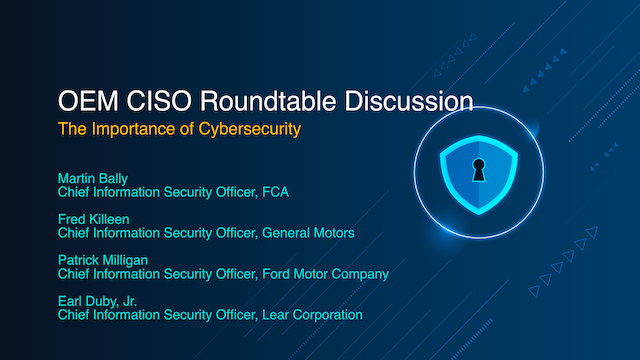 Join Earl Duby, Jr., CISO of Lear Corporation, along with Martin Bally, Chief Information Security Officer (CISO) at FCA, Fred Killeen, Chief Information Security Officer (CISO) at General Motors, and Patrick Milligan, Chief Information Security Officer (CISO) at Ford Motor Company, for a roundtable discussion on the importance of Cybersecurity. Each CISO will share insights on the best practices, and the challenges they face, in managing cyber risks, securing their company’s data, ensuring the resiliency of their supply chains, and keeping pace with today’s rapidly evolving threat landscape.