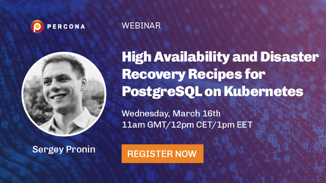 PostgreSQL is one of the world’s most advanced open source databases. Kubernetes is an open source container orchestration system for automating deployment, scaling and management of containerized applications. Deploying PostgreSQL on Kubernetes creates a scalable and portable PostgreSQL instance. But how do you implement a disaster recovery and high availability strategy for PostgreSQL on Kubernetes? Join Sergey Pronin, Group Product Manager for this session as he discusses how Percona Distribution for PostgreSQL Operator allows you to deploy and manage highly available and production-grade PostgreSQL clusters on Kubernetes. In this talk, you will learn: - The key components of setting up high availability clusters - Scaling PostgreSQL to meet the demand at peak hours - When and how to automate disaster recovery to ensure business continuity