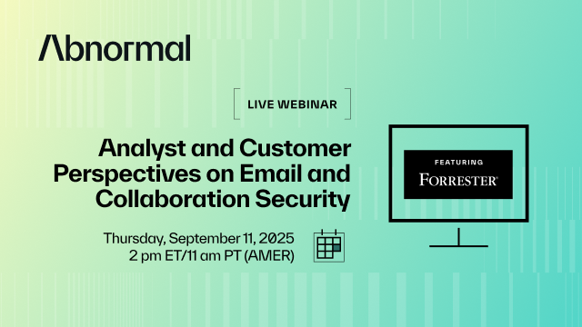 On September 11, hear from guest speaker Jess Burn, Principal Analyst at Forrester and lead author of The Forrester Wave™: Email, Messaging, and Collaboration Security Solutions, Q2 2025, Thiago De Angelo, Global Enterprise AI and Cybersecurity Architect at Dexko, as they share insights on the evolving communication security landscape, as Ryan Schwartz, Senior Manager of Product Marketing at Abnormal AI, will moderate the discussion.