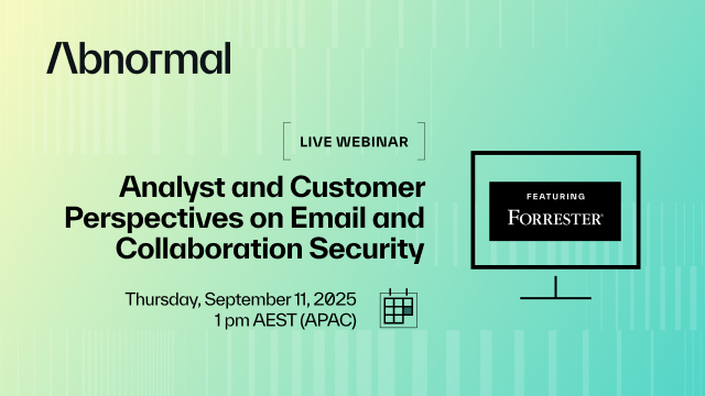 On 11 September, hear from guest speaker Jess Burn, Principal Analyst at Forrester and lead author of The Forrester Wave™: Email, Messaging, and Collaboration Security Solutions, Q2 2025, and Thiago De Angelo, Global Enterprise AI and Cybersecurity Architect at Dexko, as they share insights on the evolving communication security landscape. Ryan Schwartz, Senior Manager of Product Marketing at Abnormal AI, will moderate the discussion.