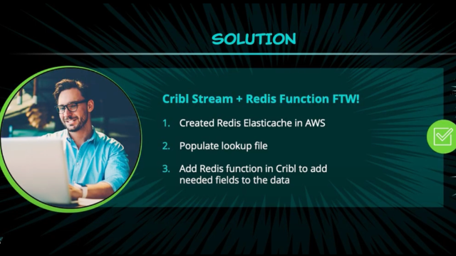 Context is king–that’s why optimizing your data, enriching it in the stream, and having the ability to see it and tweak it before sending it into analytics tools or storage can be a game changer. When you are reviewing or correlating the data to troubleshoot, run investigations and respond, think how much time your team can save by having the right geolocation, asset, timestamp and even threat intel already associated with the log data? We had a fun time making this work–and you can too. We’ll show how you can set up and use a Redis cache along with Cribl Stream to enhance your data before sending it to its destination. We’ll cover how we imported a 34 million row CSV file into Redis and use the Redis function to match fields to records to add a new field that is used for faster identification of data once it is in Splunk.