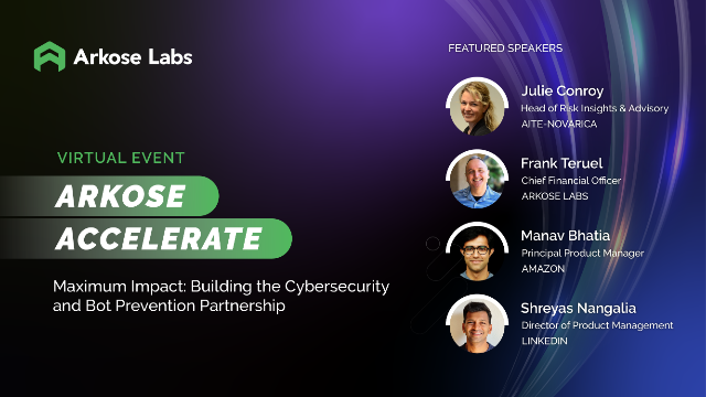 Arkose Labs invites you to be our guest for an exclusive opportunity to hear from some of the industry’s most influential thought leaders in the fight against cybercrime and bots. Join a valuable and thought-provoking discussion with Julie Conroy and Frank Teruel, two of the security and anti-fraud industry’s most respected veterans. Learn from innovative champions from Amazon and LinkedIn about their hard-won lessons defending their businesses against bot-driven attacks. Hear about exciting Arkose Labs news and updates, especially as it relates to tackling challenges like SMS Toll Fraud.