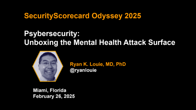 Join psychiatrist Ryan K. Louie, MD, PhD for a discussion about the “signs and symptoms” of the mental health attack surface and psybersecurity. Attendees will learn how to use the Biopsychosocial 4P Matrix to understand the mental health impacts of cybersecurity, psychiatric engineering, and what to do about it.
