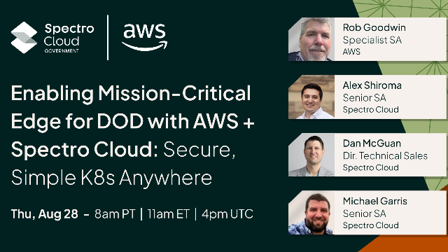 Michael Garris, Senior Solutions Architect, Spectro Cloud; Rob Goodwin, Specialist Solutions Architect, AWS; Dan McGuan, Director of Technical Sales, Spectro Cloud; Alex Shiroma, Senior Solutions Architect, Spectro Cloud