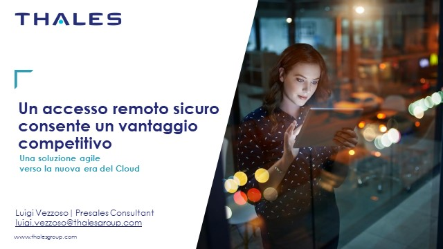 Smartworking non è più considerato il "semplice" accesso VPN alle risorse aziendali bensì, l'utilizzo in modo agile, di applicazioni tradizionali e cloud-based per ottenere la massima produttività ovunque ci si trovi a lavorare. In questo scenario è necessario garantire un elevato livello di sicurezza, la massima interoperabilità e flessibilità. Scopriamo insieme come la soluzione Thales - Safenet Trusted Access - possa supportare tutte le esigenze per un’adozione completa dello smartworking.