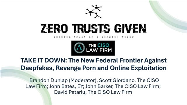 The TAKE IT DOWN Act was signed into law May 19, 2025 designed to protect families and children from deepfake AI and other fraud. In this panel discussion, they examine the major provisions of the Act and how it distinguishes between authentic imagery and AI-generate “Digital forgeries”, the 48-hour takedown requirement, scope of “covered platforms and how the Act interacts with Section 230 of the Communications Decency Act. Attendees will also learn about: