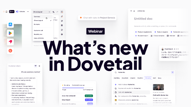 Join Dovetail experts Cheri March and Alissa Lydon as they show you how to leverage our latest products and features to help your teams leverage the insights in disparate customer data, and turn that into customer intelligence. Learn how Dovetail streamlines data centralization, uses the latest in AI to automatically uncover insights hidden in complex feedback, and makes those insights instantly available to anyone in your organization.