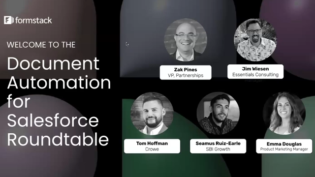 During this roundtable, VP of Partnerships Zak Pines discusses with the panel how to optimize document generation automation, directly in Salesforce. We share three customer case studies where they were able to create robust documents with a few simple clicks, then share and collect secure signatures as well. Examples include those from the business, insurance, and education industries. Viewers will learn: -Real examples of how to solve common document automation challenges -The key tools and features needed for document automation to scale -Expert tips on how to approach a document automation project -How to use the AI template generator in Formstack Documents