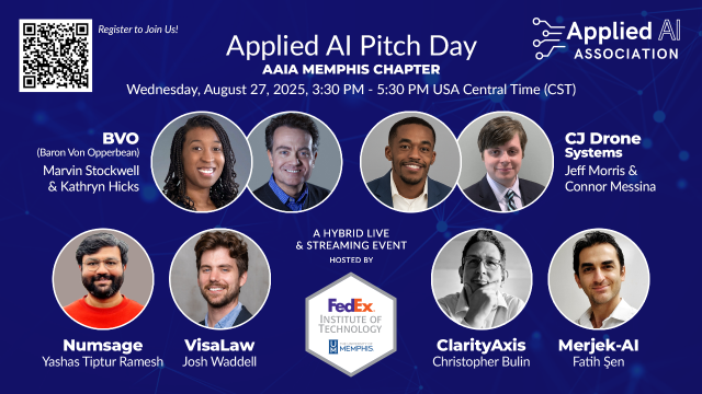 This Pitch Day culminates months of effort initiated in April by the AAIA Memphis Chapter to evaluate the city’s applied AI startup ecosystem, including a June pitch rehearsal via the Memphis AI & AR Meetup. Connor Messina of CJ Drones, and JC Smiley of the Memphis Tech Scene Newsletter were instrumental is this endeavor—highlighting local collaboration and ecosystem development.