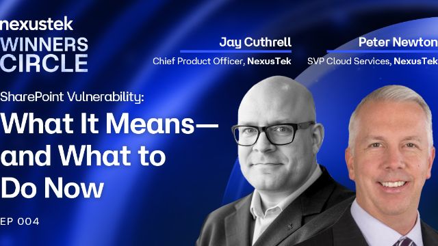 Chief Product Officer Jay Cuthrell and SVP of Cloud Services Peter Newton break down how attackers are using compromised on-premises SharePoint environments as entry points to broader systems. The discussion explores the growing divide between legacy and modern infrastructure, the urgency of moving away from on-premises dependencies, and why cloud is no longer just a scalable strategy—it’s critical to business success. From emergency patching to long-term migration strategy, the episode offers a practical path forward for organizations still operating vulnerable workloads. Learn how NexusTek supports secure, low-disruption SharePoint migrations and why moving to a cloud operating model is your best defense against what’s next.