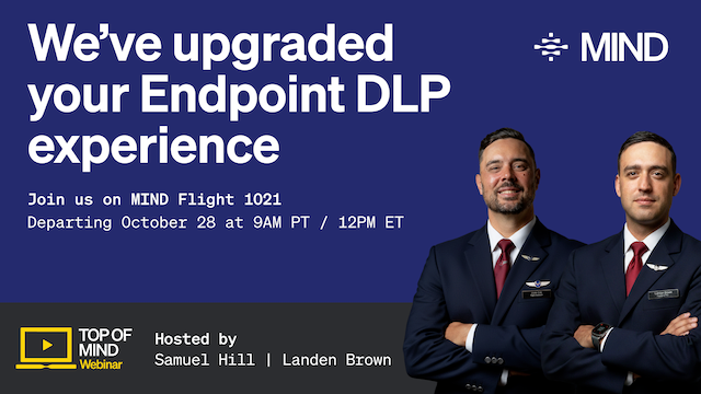 MIND is upgrading Endpoint DLP to give security teams visibility, precision and peace of mind, at machine speed. Now you can protect your endpoints with a single lightweight agent that protects data in motion and at rest, while reducing noise and giving teams their time back.