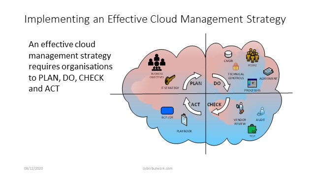 PLAN – DO – CHECK- ACT… It’s really not as complicated as it appears; you’ve done it all before, on-premise. In light of the many benefits associated with the use of cloud services, organisations are keener than ever to jump on the cloud bandwagon. Key Cloud benefits; Increased cost efficiency Flexible pricing options Easily scalable resources Freedom to offload cumbersome IT functions Improved collaboration Increased user mobility To truly reap the benefits of cloud services, and avoid falling foul of legal and regulatory requirements, many organisations need to evidence due care and diligence in their defence against the ever present threat of cyberattacks. An effective cloud management strategy requires robust security controls at its core; it requires organisations to PLAN, DO, and CHECK; enabling them to ACT in the event of a security breach.
