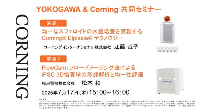 演題1 均一なスフェロイドの大量培養を実現するCorning® Elplasia® テクノロジー Corning Elplasia テクノロジーは、独自のマイクロキャビティ技術で、足場なしで大量のスフェロイドを形成することができます。多くの細胞タイプに適合し、薬物スクリーニング、がん/腫瘍生物学、幹細胞生物学、細胞治療研究、3D組織工学など、多くのアプリケーションに対応しています。本セミナーではT75フラスコと同様のフットプリントのCorning Elplasia 12Kフラスコと、ANSI/SLAS規格に準拠したCorning Elplasia 12Kオープンウェルプレートに加え、次期新製品もご紹介いたします。 演題2 FlowCam:フローイメージング法によるiPSC 3D培養球の形態解析と均一性評価 iPSCの3D培養では、細胞の均一性と拡張性を適切に評価することが不可欠です。FlowCamはフローイメージング法を採用し、数千のiPSCの形態や、サイズ分布を解析し、細胞培養状況を正確に把握することが可能です。最新のフローイメージング技術を駆使した新たなiPSC品質評価解析手法をご紹介いたします。