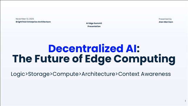 As breakthrough technologies like AI mature, they inevitably evolve from centralized to decentralized architectures. With global edge computing spending projected to reach $378 billion by 2028, organizations that continue relying solely on centralized AI risk falling behind in both efficiency and performance. The pervasive waste and expense of centralized generative AI models have underscored the urgent need for intelligence at the edge. While edge computing concepts have existed since the 1990s with content delivery networks, today's businesses face the complex challenge of transforming their architectures to process data closer to its source. This session explores how leading organizations are navigating this transition, reducing latency and costs while competing with decades of established centralized cloud infrastructure. Join Alan Morrison (Advanced Data Technologies Consultant and Writer) to discover how decentralized AI and edge computing are revolutionizing data processing across industries. Key Takeaways: - Understand why centralized AI approaches are becoming unsustainable and how edge computing addresses these limitations - Learn practical strategies for implementing edge intelligence from organizations already succeeding with this approach - Discover the economic benefits of processing data at the edge versus transmitting everything to centralized systems - Gain insights into market growth projections and how to position your infrastructure investments accordingly - Identify the architectural transformation challenges of edge computing and how to overcome them