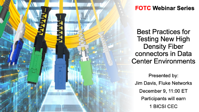 With the transition from single ferrule connectors such as the LC and SC to Multi-Fiber connectors like the MPO and MTP, and newer connectors like the MMC and SN-MT, what changes can we expect in testing? Join Jim Davis, Fluke Networks, and the FOTC to review different aspects of the testing process including limit selection, fiber identification, Tier I and Tier II test requirements, and, of course, inspection and cleaning. With proper specification, set-up, testing, and reporting Installers, Contractors, and End Users can ensure that the physical layer will support the demands of modern applications. Participants will earn one BICSI CEC.